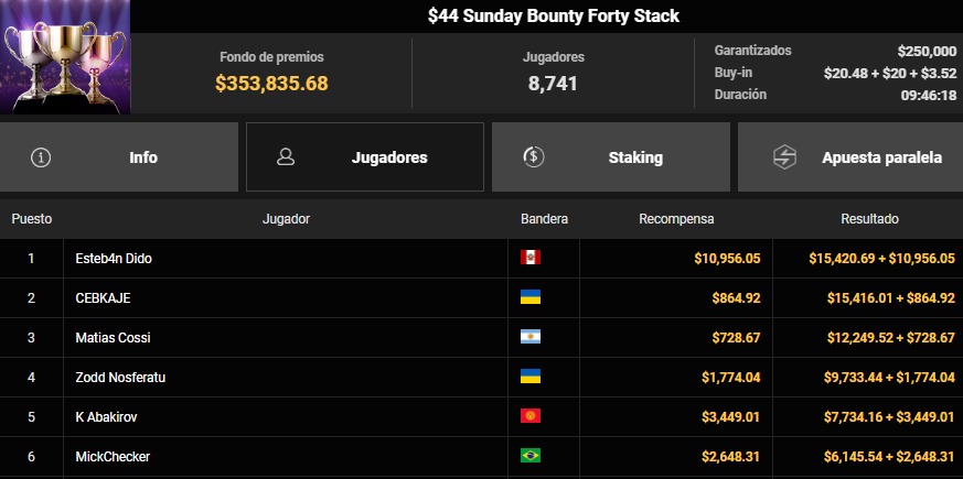 La historia más impactante de la jornada la protagonizó el jugador identificado como «Esteb4n Dido». Con una inscripción de apenas $44, el compatriota se enfrentó a un «mar» humano de 8,741 participantes en el Sunday Bounty Forty Stack.