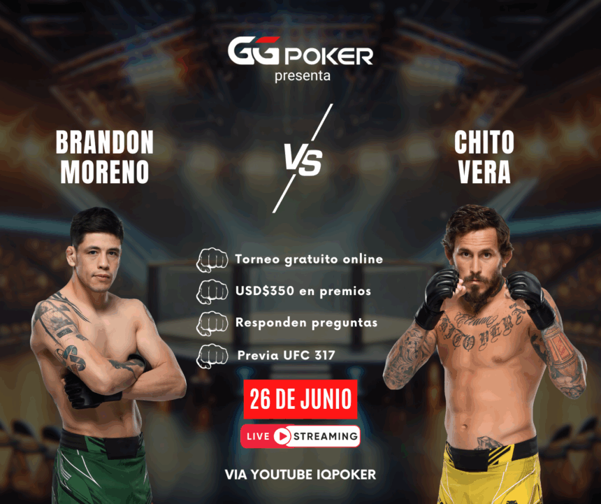 Este jueves 26 de Junio, las estrellas de la UFC llegan a GGpoker donde habrá un stream especial con el mexicano Brandon Moreno y el ecuatoriano Chito Vera donde estarán compartiendo sus anécdotas, respondiendo preguntas de los seguidores y con la previa de UFC 317 que se disputa este sábado.