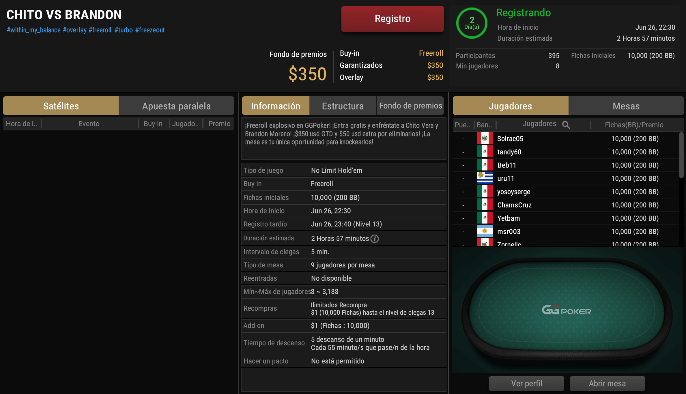 Este stream se celebrará con un torneo gratuito online con USD$350 dólares que Brandon Moreno y Chito Vera estarán comentando en vivo mientras se juega. El acceso es totalmente gratis y puedes hacerlo registrándote aquí: https://bit.ly/GGpokerLuchadores