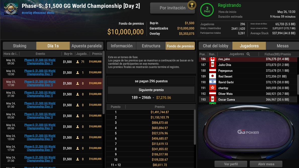 Este lunes 26 de mayo continúa la acción fuerte en GGPoker con el Día 2 del $1,500 GG World Championship, uno de los torneos centrales del GG World Festival. Con un premio garantizado de $10,000,000 dólares, este evento se perfila como uno de los más importantes del año en el póker online, no solo por el pozo millonario, sino también por su formato y las múltiples formas de clasificar.
