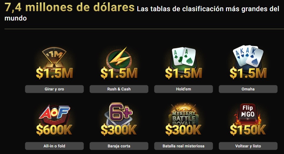 Más de $7 millones se distribuirán en los diferentes rankings según el tipo de juego. Ya sea que prefieras Spin & Gold, Rush & Cash, Hold’em o PLO, cada mano cuenta para ganar premios diarios. Incluso formatos como Short Deck, Flip & Go o Batalla Real Misteriosa también reparten miles de dólares en cada tabla de clasificación.