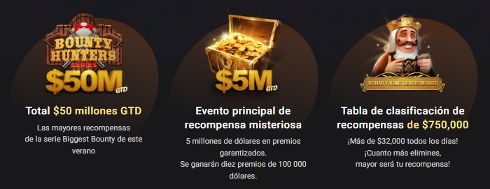 A lo largo de la serie, cada eliminación sumará puntos en el Bounty King Leaderboard, una clasificación que entregará más de $32,000 en premios todos los días. Cuanto mayor sea el buy-in y más eliminaciones logres, más puntos ganarás y más cerca estarás de los premios extra.