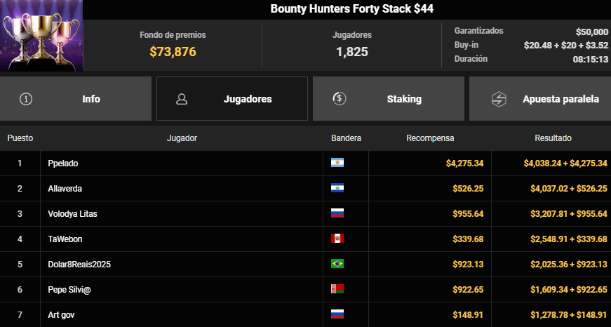 Poco después, volvió a sobresalir en el Bounty Hunters Forty Stack $44, uno de los torneos más concurridos de la plataforma con 1,825 inscripciones. Allí, el peruano alcanzó el cuarto lugar, sumando $2,888.59 en premios totales y compartiendo mesa final con jugadores de Argentina y Uruguay.