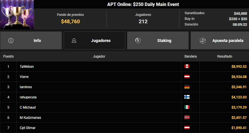 En el APT Online: $250 Daily Main Event, Figallo alcanzó el título tras superar un field de 212 jugadores, llevándose un premio de $8,992.52 luego de más de ocho horas de juego. Fue una victoria muy trabajada que lo coloca entre los nombres más fuertes del póker online peruano.