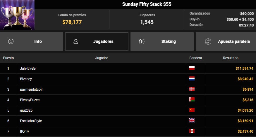 Para quienes buscan estructura con un buy-in accesible, el Sunday Fifty Stack $55 cumplió las expectativas reuniendo a 1,545 jugadores. El triunfo fue para Jah-Ith-Ber, que se llevó $11,594.74 a su cajero. En la lucha por el título también estuvieron Bizeeey y paymeinbitcoin, quienes ocuparon el segundo y tercer lugar respectivamente. Destacó también la constancia de «IfOnly», quien logró navegar un field inmenso para terminar en el séptimo puesto tras casi diez horas de juego.