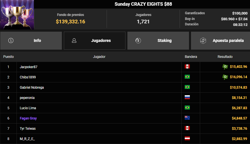 Uno de los resultados más importantes fue en el Sunday CRAZY EIGHTS $88. Con 1,721 inscritos, el pozo escaló hasta los $139,332.16. El protagonismo se lo llevó «Jacpoker87», quien tras una batalla de más de ocho horas se hizo con el primer lugar y un premio de $15,402.96. En el duelo final, Chibs1899 se quedó con el segundo puesto, aunque por la dinámica del torneo terminó cobrando algo más, $16,096.14. El podio lo cerró Gabriel Nobrega, mientras que Tyr Teiwas logró una meritoria séptima posición en una mesa final sumamente agresiva.