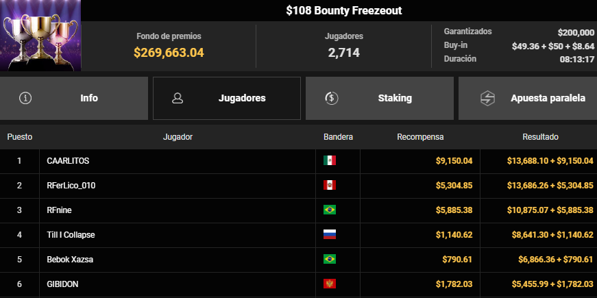 En el terreno de los bounties, el $108 Bounty Freezeout fue uno de los eventos más masivos con 2,714 participantes. Aquí, el manejo de las recompensas por eliminación fue clave para el ganador, CAARLITOS, quien se embolsó un total de $22,838.14. Le siguió de cerca «RFerLico_010″, quien cuajó un torneo impecable para llevarse $18,991.11 entre su premio por posición y las cabezas cobradas. RFnine completó el trío de cabeza en un field que repartió más de un cuarto de millón de dólares.