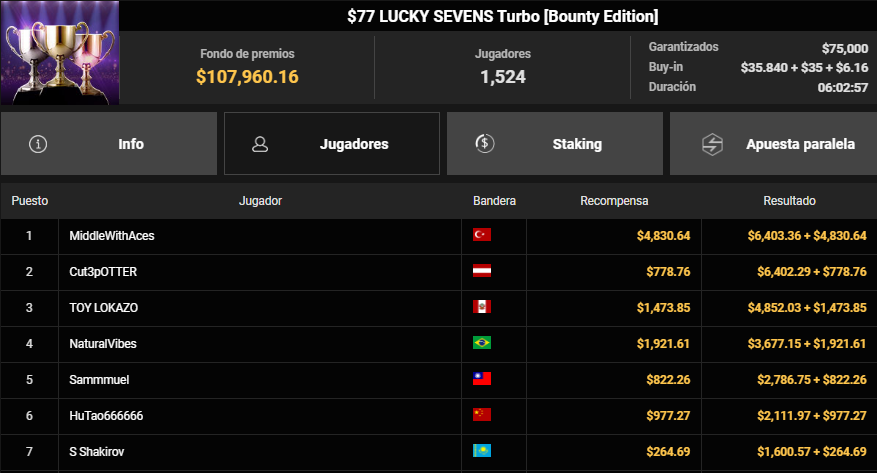 Finalmente, el $77 LUCKY SEVENS Turbo cerró con 1,524 entradas y un pozo de $107,960.16. El turco MiddleWithAces se llevó los honores y $11,234. Sin embargo, todas las miradas estuvieron en la gran actuación de «TOY LOKAZO», quien se metió de lleno en el podio final con un tercer puesto que le valió $6,325.88. Fue una mesa final con banderas de todas partes, Austria, Brasil, China y Kazajistán, reflejando el carácter global de la sala.