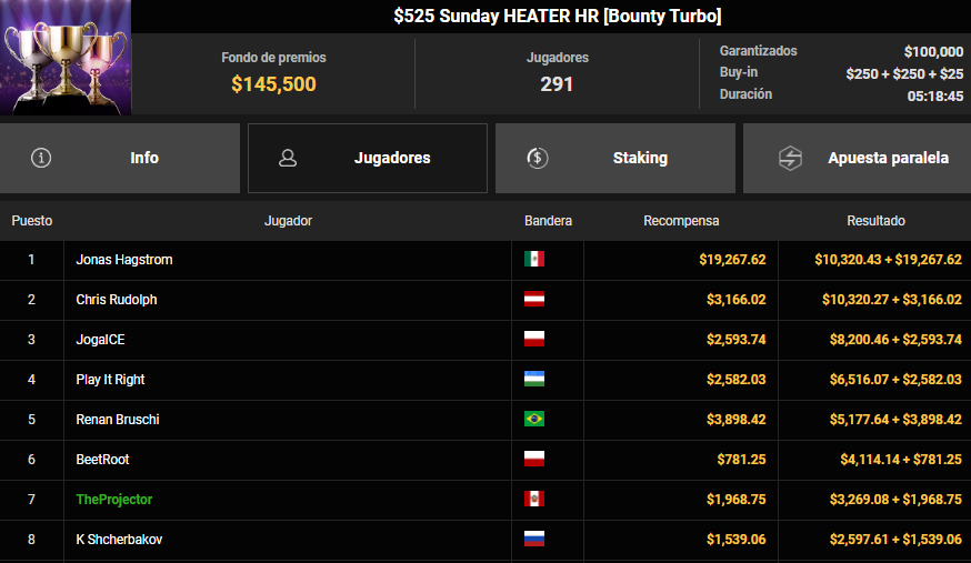 En el segmento para profesionales y bancas más sólidas, el $525 Sunday HEATER HR puso a prueba a 291 especialistas. Jonas Hagstrom dio una clase de dominio en formato Bounty Turbo llevándose casi 30 mil dólares entre premio y recompensas. La mesa final fue un desfile de nombres conocidos, incluyendo a Renan Bruschi. En este entorno de alta exigencia, Diego Ventura, bajo el nick «TheProjector», volvió a demostrar su vigencia alcanzando el séptimo lugar con un cobro combinado de $5,237.83.