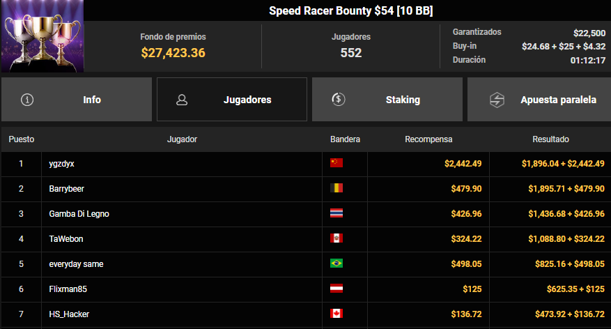 La adrenalina subió de tono con el Speed Racer Bounty $54, un formato turbo que no da respiro. En apenas una hora y doce minutos, 552 jugadores definieron el torneo. El ganador fue ygzdyx con un cobro de $4,338.53. En esta mesa final tan rápida, Luis Figallo, compitiendo como TaWebon, demostró su capacidad de adaptación al asegurar la cuarta plaza con un premio total de $1,413.02, superando a jugadores de Brasil y Austria en la fase crítica.