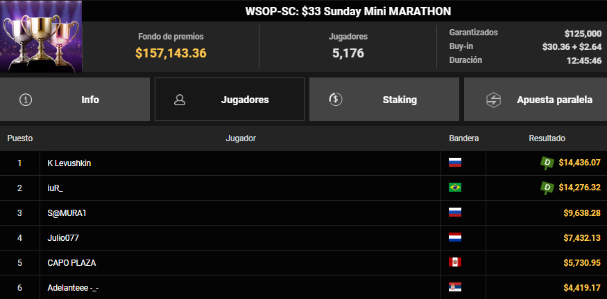 En una de las competencias más agotadoras de la fecha, el WSOP-SC: $33 Sunday Mini MARATHON, el jugador «CAPO PLAZA» dio una lección de resistencia. Tras casi 13 horas de juego ininterrumpido y frente a más de 5,100 oponentes, logró meterse en el Top 5 del torneo. Por su quinto puesto, el compatriota se adjudicó $5,730.95, un premio que premia su capacidad de concentración y gestión de stack en una estructura que no perdona el cansancio.