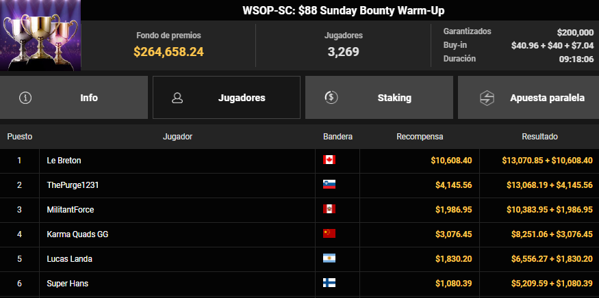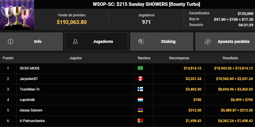 Por otro lado, «Jacpoker87» estuvo a nada de llevarse la gloria máxima en el WSOP-SC: $215 Sunday SHOWERS. En un formato turbo donde los errores se pagan caro, el peruano demostró mucha frialdad para alcanzar el segundo lugar. Entre el premio por su posición y los «bounties» acumulados por eliminar rivales, se llevó a casa la suma de $14,273.84. Fue una actuación redonda en la que solo el brasileño «SICKO MODE» pudo frenar su avance en el duelo final.