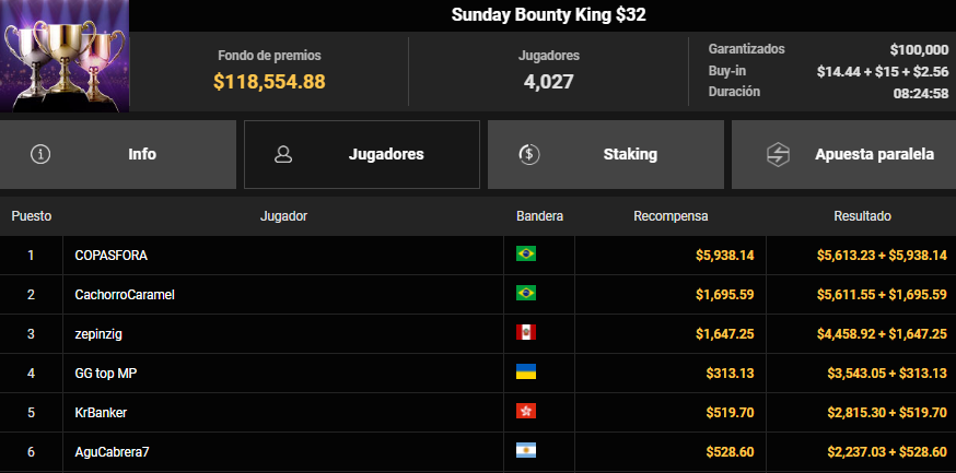 Uno de los resultados más destacados llegó de la mano de «zepinzig», quien se fajó en el Sunday Bounty King $32. En un torneo que reunió a más de 4,000 inscritos, el peruano logró escalar hasta la tercera posición tras una batalla de más de ocho horas. Su esfuerzo fue recompensado con un premio total de $6,106.17, una cifra nada despreciable considerando el bajo costo de entrada y el enorme field que tuvo que dejar en el camino antes de caer frente a la armada brasileña.