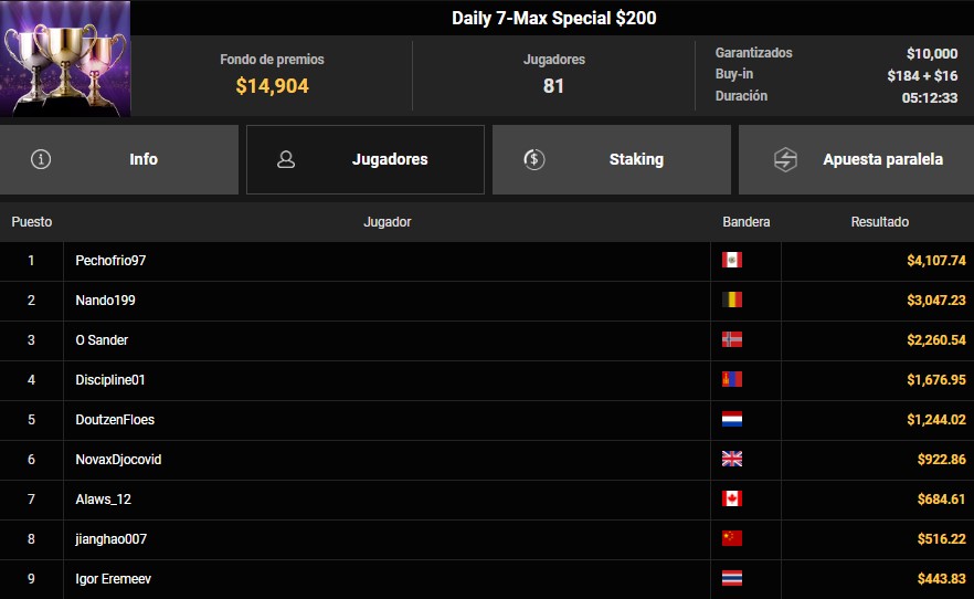 En el Daily 7-Max Special de $200, el campeón fue peruano. El usuario «Pechofrio97» logró superar a los 81 participantes del torneo y se quedó con el primer lugar, obteniendo $4,107.74 dólares. La victoria no solo representa un premio importante, sino también una muestra más del buen momento de los jugadores peruanos en la plataforma.