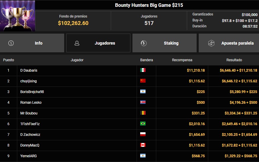 Y en el Bounty Hunters Big Game de $215, el título también se quedó en Latinoamérica. El mexicano «D Daubaris» cerró una gran actuación para quedarse con el primer lugar y un premio total de $17,856.58 dólares. En ese mismo torneo, el argentino «BorisBrejcha98» logró llegar hasta el tercer puesto, sumando $5,505.99, mientras que el brasileño «1FishFixeFiz» ocupó la sexta posición con una ganancia de $4,116.66.