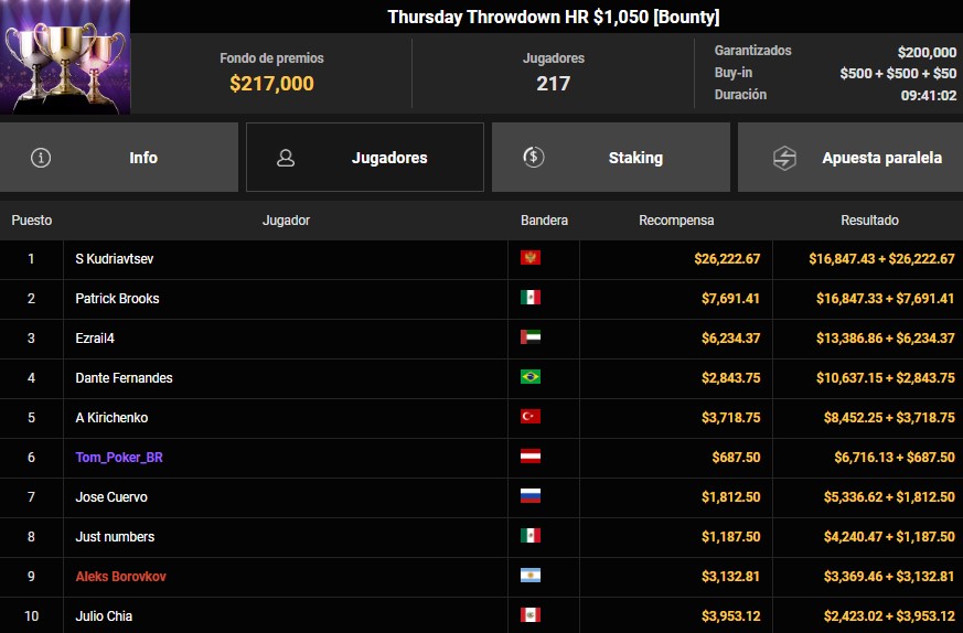 En el Thursday Throwdown High Roller de $1,050, el mexicano Patrick Brooks fue uno de los protagonistas principales. Luego de casi 10 horas de juego, logró llegar al mano a mano final y quedarse con el segundo lugar, llevándose $7,691.41 en recompensas y $16,847.43 por su posición, sumando un total de $24,538.84 dólares. En esa misma mesa final también estuvo el brasileño Dante Fernandes que se quedo en el cuarto lugar($13,480), el peruano Julio Chia, quien se mantuvo sólido durante buena parte del torneo y finalizó en décimo lugar, cobrando un total de $6,376.14 dólares tras asegurar varios bounties.