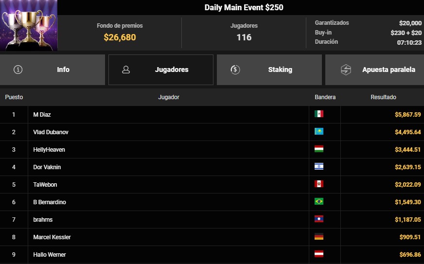 En el Daily Main Event $250, que reunió a 116 jugadores y duplicó su garantía hasta superar los $26,000 en premios, Luis Figallo, conocido como «TaWebon», cerró su participación en el quinto lugar. Su esfuerzo fue recompensado con $2,022 dólares, en una competencia que vio como campeón a un jugador mexicano seguido por rivales de Europa del Este y Medio Oriente.