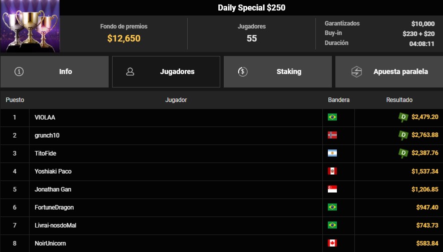 Por otro lado, el Daily Special $250 también tuvo bandera peruana en la definición. Yoshiaki Paco alcanzó la cuarta posición entre 55 jugadores, sumando $1,537 dólares a su cuenta tras una sólida actuación. Este torneo también superó su garantía, generando un pozo de más de $12,000 en apenas unas horas de juego.