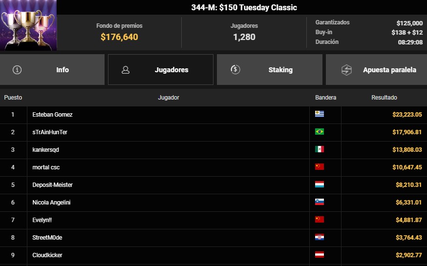 Nuevos ganadores con importantes premios se conocieron el pasado martes en el sitio de poker más grande del mundo, GGpoker. Esteban Gómez (uruguay) fue el gran protagonista del torneo $150 Tuesday Classic, tras imponerse en una participación total de 1,280 entradas que elevó el pozo de premios hasta los $176,640 dólares, muy por encima del garantizado inicial.