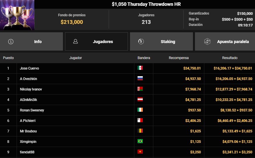 Tras más de nueve horas de juego, el mexicano se quedó con la victoria y un premio total de $50,956.18, dejando en el segundo puesto al ruso A. Ovechkin, quien recibió $16,206 más $4,937.50 por las recompensas. En el podio también apareció el búlgaro Nikolay Ivanov, con una recompensa total de $20,846 al sumar sus cobros por bounties y posición.